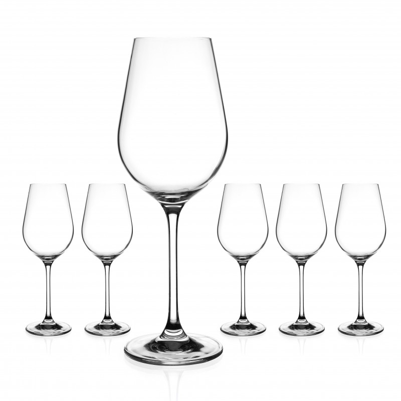 Šesť malých pohárov na víno určené pre všetky druhy bielych a ružových vín. Obsah 350ml. Vhodné do umývačky na riad.