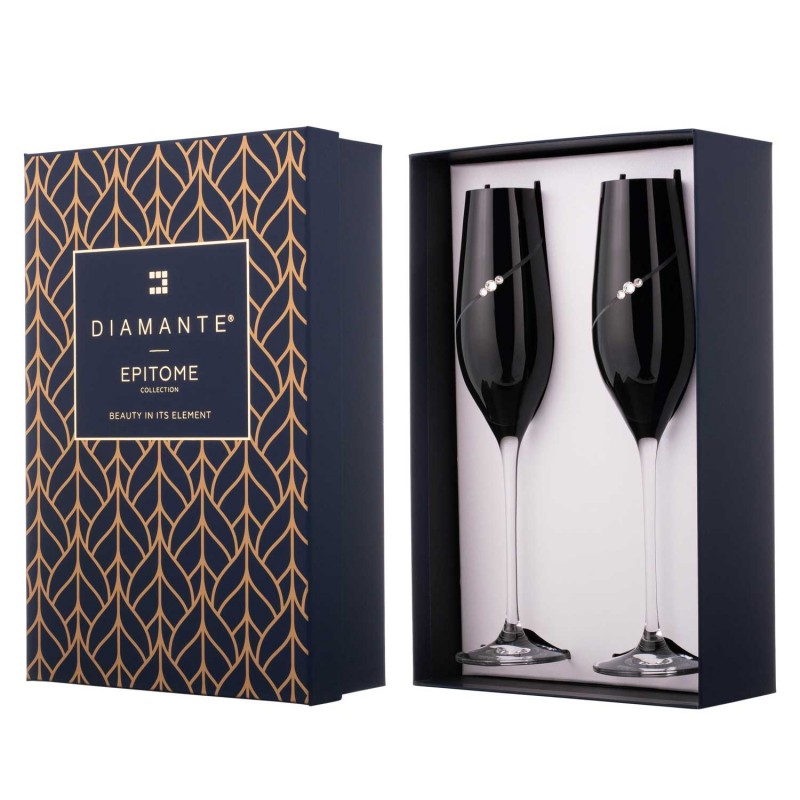 Dva úzke poháre na všetky druhy šumivých vín ako je šampanské, prosecco, alebo cava. Každý pohár má obsah 210ml a je zdobený s matnou špirálou a Swarovski® kamienkami. Čierna farba je určená pre potravinárske účely a je samozrejme umývateľná – poháre môžete bez problémov použivať ako klasické číre poháre.