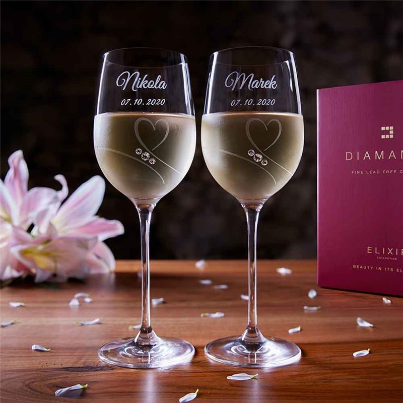 Pár svadobných pohárov zdobenými so Swarovski® Elements. Balené v elegantnej krabičke ‘Diamante Elixir’. Uvedená cena je za dva poháre vrátane krabičky a gravírovania.
