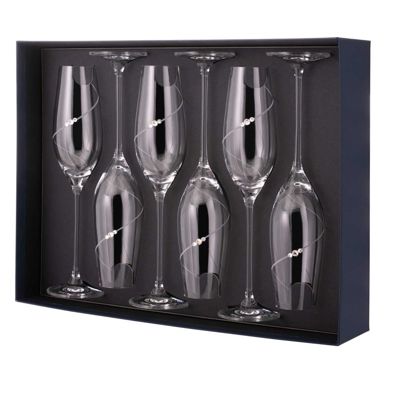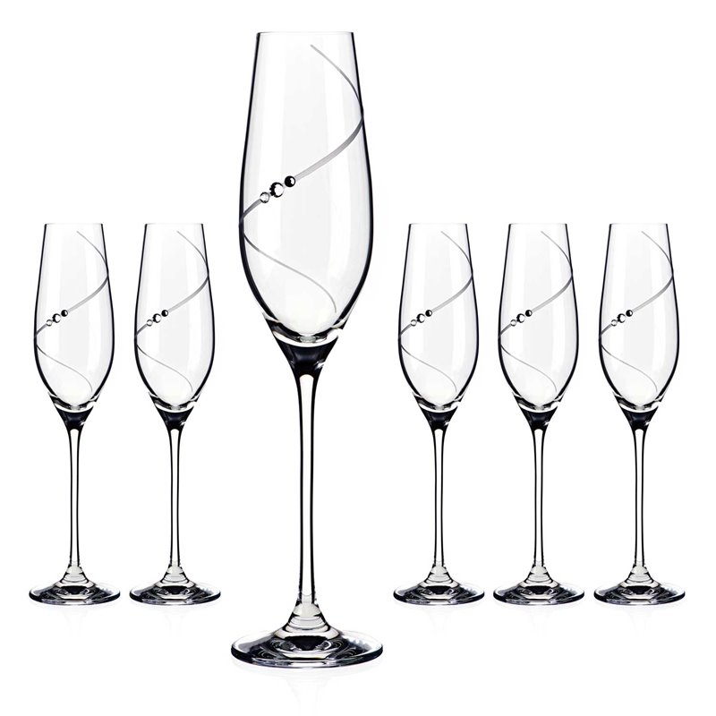 Sada šiestich pohárov na všetky druhy šumivých vín ako napríklad šampanské, alebo prosecco. Poháre majú obsah 210ml a sú zabalené v modro-čiernej krabici Diamante® Epitome. Každý pohár je brúsený s jemnou špirálou a ručne zdobený s tromi Swarovski® kamienkami.