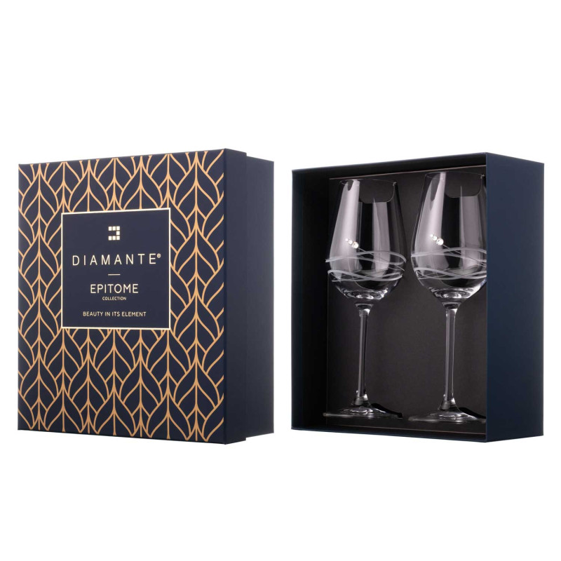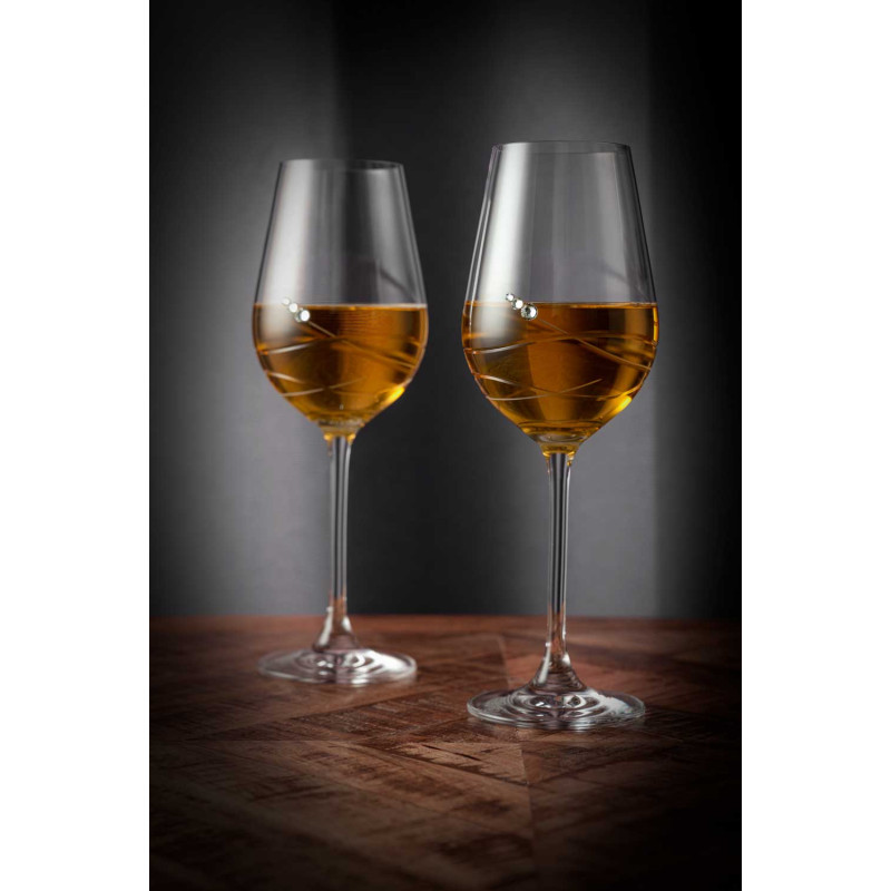 Poháre sú zdobené jemným vzorom s tromi pravými kryštálmi Swarovski. Vytvorte si jedinečnú spomienku na Váš výnimočný deň s vlastnými menami a dátumom svadby. Balené v elegantnej krabičke ‘Diamante Elixir’.