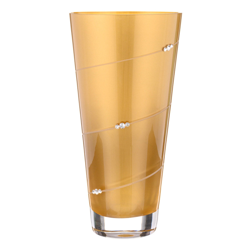 Sklenená váza zlatej farby s tradičným tvarom je vyrobená s dôrazom na najmenší detail v jej dekorácii. Hodí sa na moderný, luxusný aranžmán. Jej kvalita a spracovanie Vám pri ručnom umývaní zaručujú, že Vám váza bude slúžiť dlhé roky.